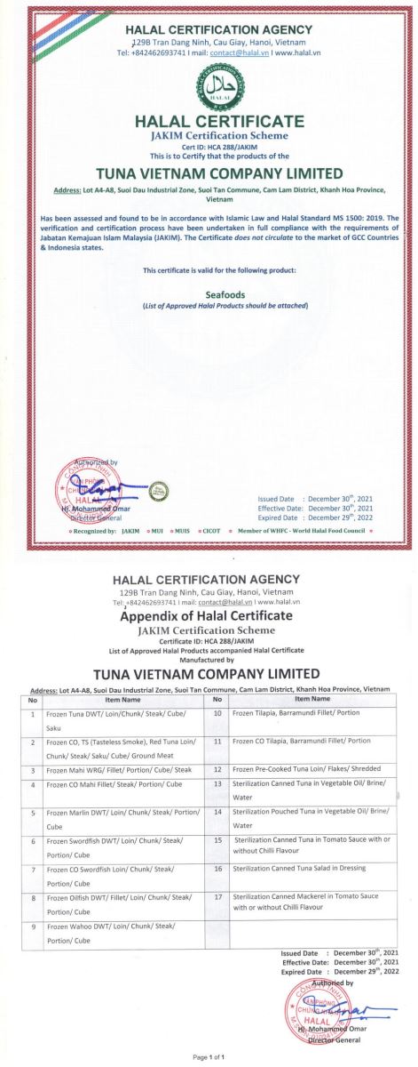 - "Halal Certificate" for Tuna Vietnam (2016).